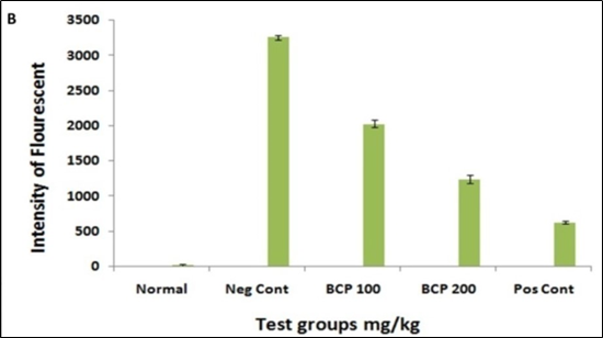 圖(B):將圖(A)的螢光訊號量化後可得到圖(B)長條圖,螢光訊號數值越大表示發炎程度越高。